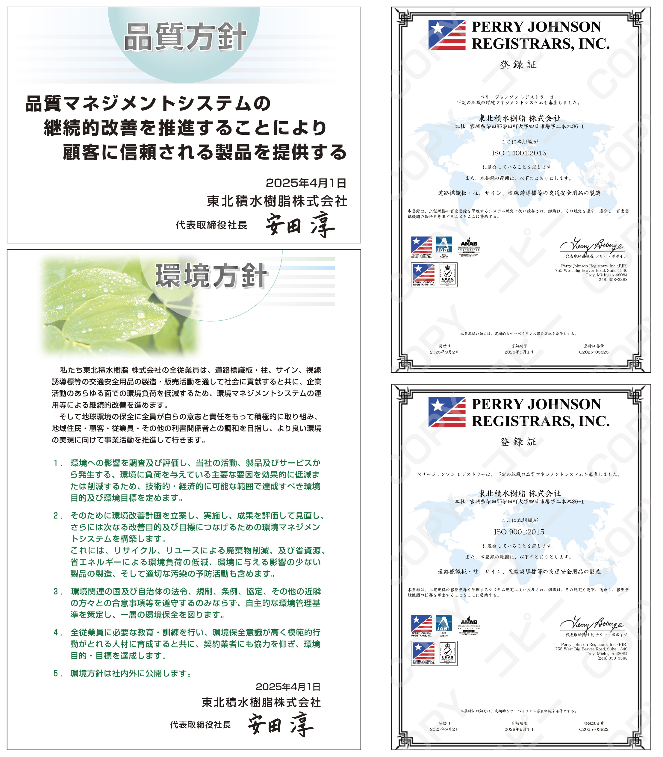 当社は、積水樹脂グループ会社の一員として、「複合技術による価値ある製品の創造とサービスを通じて社会の安全・安心・環境に貢献する企業グループを目指します。」という経営理念に基づき事業展開してまいります。